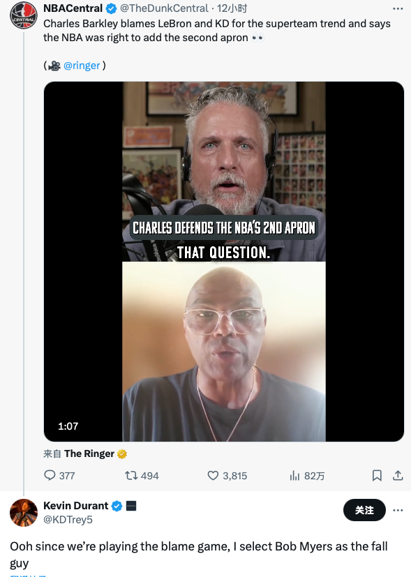 对于巴克利的指责,杜兰特在社交媒体上转发了巴克利的言论,并回复道:“哦,既然我们在玩推卸责任的甩锅游戏,那我就选鲍勃·迈尔斯当替罪羊。”鲍勃·迈尔斯是此前勇士的总经理,一手打造了勇士的4冠王朝。